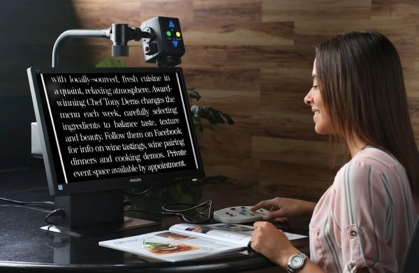 A desktop video magnifier that incorporates an integrated light, high definition camera, expert optics and a widescreen LED 22 inch hi resolution monitor. This is a great unit for reading, writing, viewing photos and so much more!